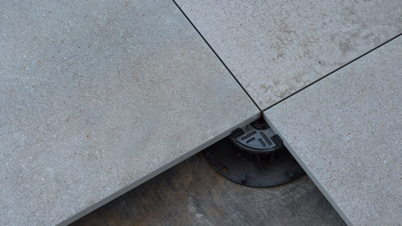 En los suelos sobreelevados, la correcta gestión de las juntas entre las losas desempeña un papel fundamental en el drenaje del agua. Los espacios entre los elementos deben ser suficientes para permitir el rápido drenaje de las precipitaciones hacia el plano inferior, evitando encharcamientos en la superficie del pavimento. A lo largo de los bordes y cerca de las paredes, es también buena práctica prever un espacio perimetral adecuado, para no obstaculizar el flujo natural del agua.